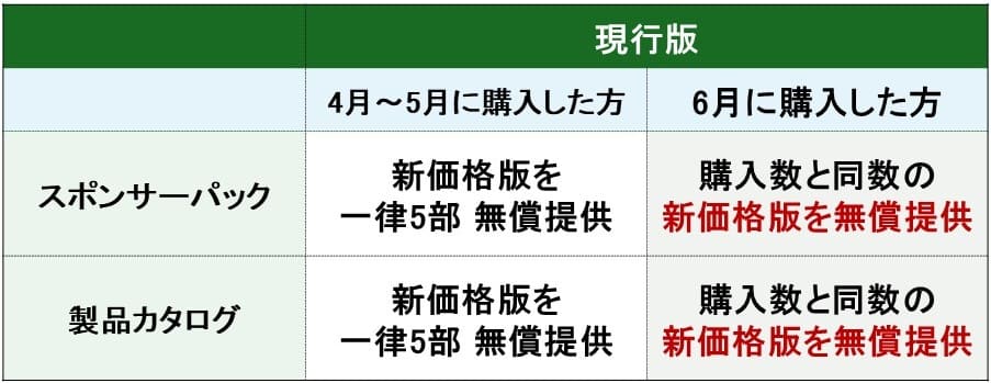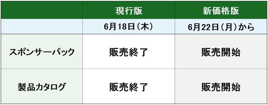 現行版のスポンサーパックと製品カタログは6月18日(木)に販売終了となります。新価格版のスポンサーパック、製品カタログは6月22日(月)から販売を開始します。