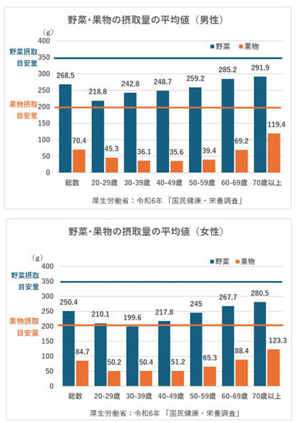 世界の様々な研究機関が1日あたり800gの野菜・果物の摂取を推奨しています。日本での厚生労働省の調査によると、野菜350g、果物200gの摂取を推奨していますが、日本人の70%が摂れていません。