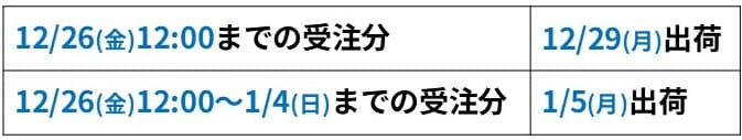 年末年始休業のお知らせ HOME年末年始の休業のお知らせ年末年始の休業のお知らせ平素は格別のお引き立てを賜り、厚く御礼申し上げます。 誠に勝手ながら、弊社の年末年始の休業日を以下の通りとさせていただきます。また、製品の年末年始の配送スケジュールについても下記の通りとさせていただきます。 皆さまにはご不便をおかけいたしますが、何卒ご了承いただきますようお願い申し上げます。12月度の締め日年末年始の休業日のお知らせ年末年始休業中の出荷スケジュール ※入金確認分